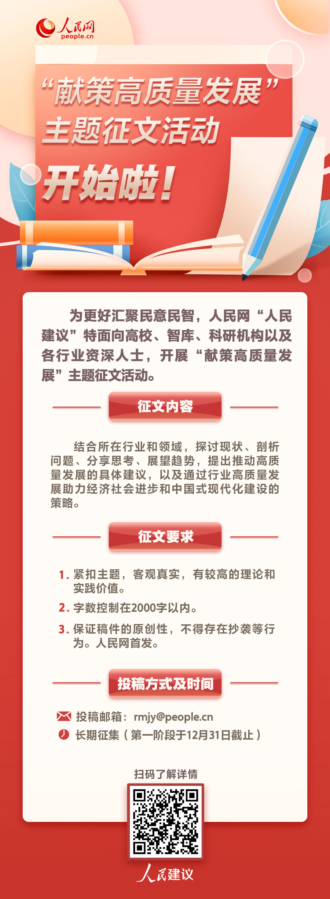 为更好汇聚民意民智,人民网“人民建议”开展了“献策高质量发展”主题征文活动,邀请专家学者和各领域资深业内人士,为推动经济社会高质量发展、不断实现人民群众对美好生活的向往建言献策。